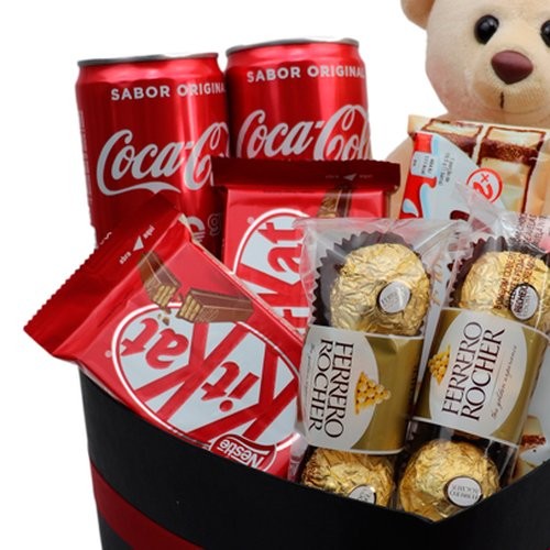 Um lindo kit em formato de coração, composto por um ursinho de pelúcia, kinder bueno 43g, ferrero rocher 37,5g, kitkat 41,5g, refrigerantes coca cola. Compartilhe esse lindo presente com a pessoa amada.